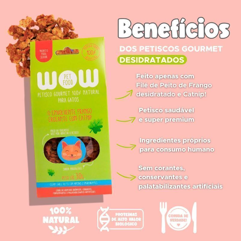 Petisco Natural Gourmet de Filé de Peito de Frango com Catnip para Gato O nosso petisco natural para gatos faz muito sucesso mesmo entre os felinos mais exigentes! Feito apenas com filé de peito de frango e catnip, é um petisco saudável que não possui absolutamente nenhum corante, conservante ou palatabilizante artificial. É tudo comida de verdade! Todos os ingredientes são próprios para consumo humano, dos mesmos fornecedores de restaurantes e supermercados, ou seja, realmente utilizamos o que há de melhor! Além disso, passam por um processo desenvolvido pela WOW para que cheguem até vocês sempre fresquinhos, deliciosos e crocantes! Tudo para favorecer a alimentação saudável e dieta equilibrada do seu gatinho! Os petiscos desidratados podem ser usados no enriquecimento ambiental para gatos, oferecidos como recompensa no adestramento do seu pet ou apenas como um agrado saudável e delicioso! Os petiscos naturais podem ser hidratados para deixá-los mais macios e também estimular a ingestão de água do seu peludo. Basta adicionar água, aguardar por aproximadamente 2 minutos e servir. Nesse caso, consumir imediatamente. |